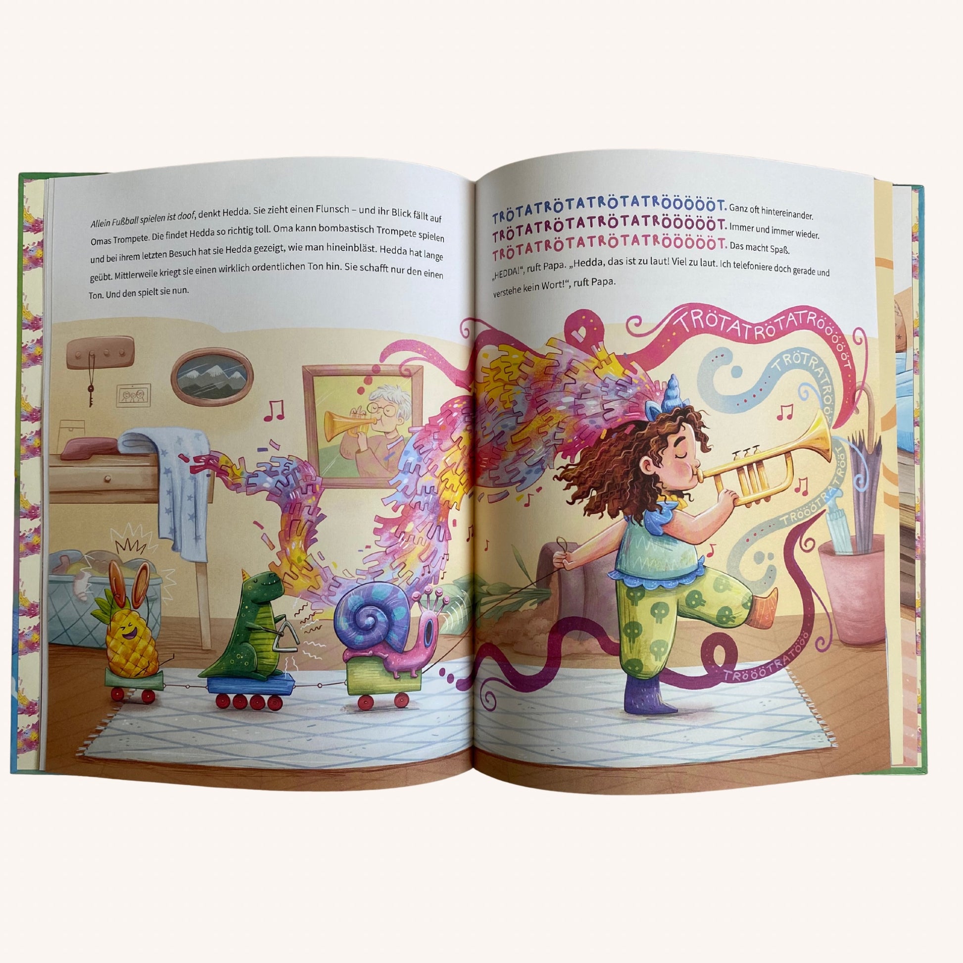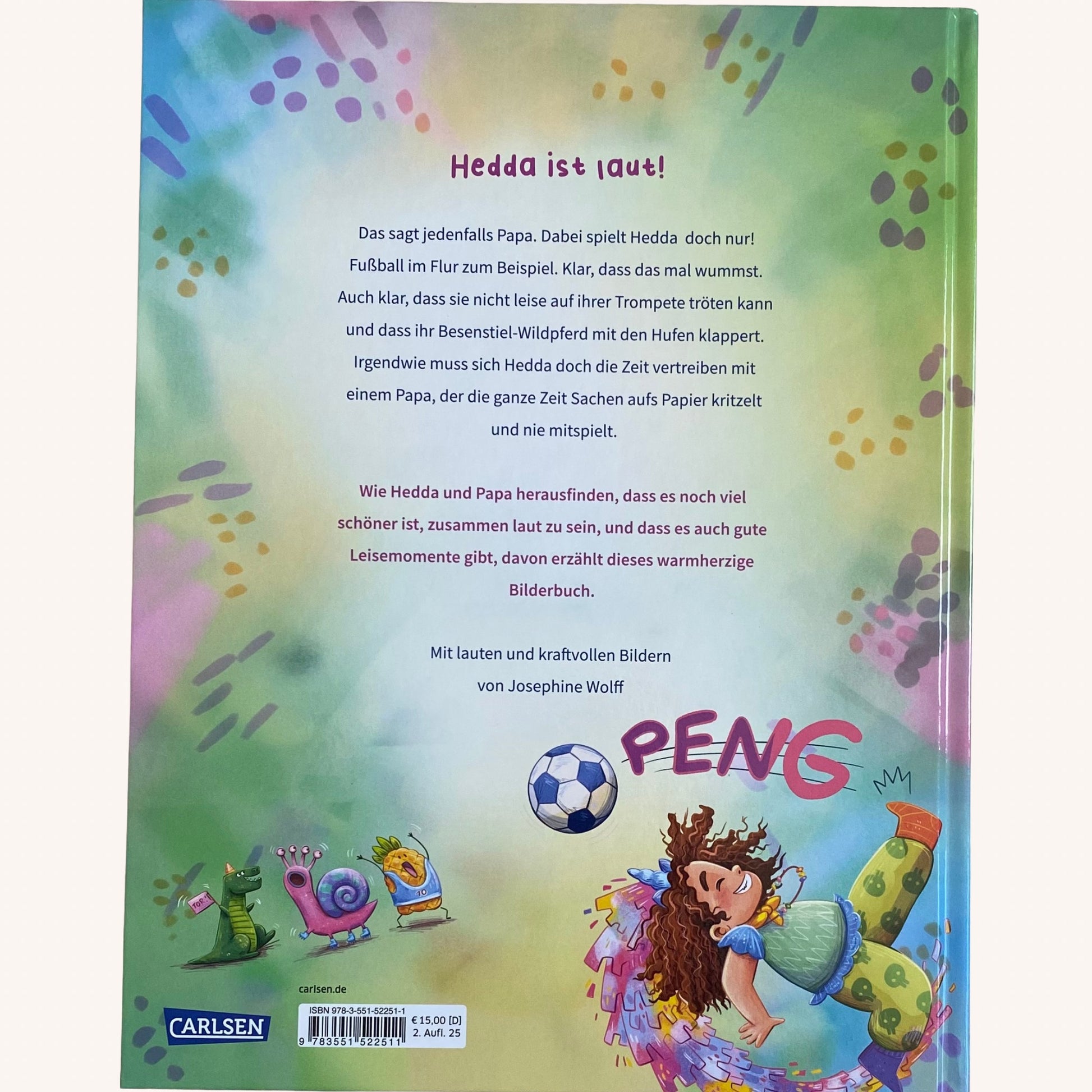 Hedda findet das sehr seltsam, denn über die bellenden Nachbarshunde, das knatternde Motorrad vor dem Fenster oder die wummernde Waschmaschine in der Küche beschwert Papa sich nie. Dabei machen die wirklich Krach. Sie hingegen spielt doch nur! Fußball im Flur, zum Beispiel. Klar, dass das auch mal wummst. Auch klar, dass sie beim Erschreckenspielen ganz laut „Buh“ rufen muss, dass sie in Omas Trompete nicht leise pusten kann und dass Skitty, ihr Besenstiel-Wildpferd, nun mal mit dem Hufen klappert.